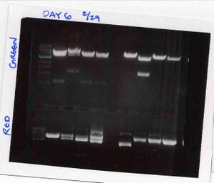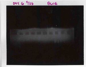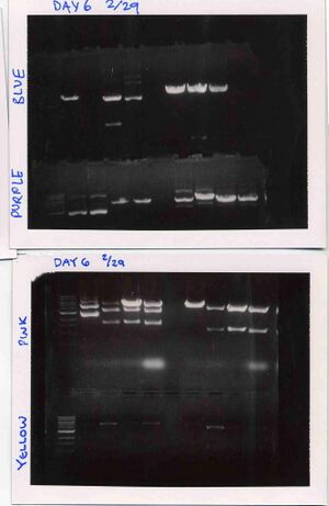 The gels were pretty bright today, including the ladder. For the blue group, the MW ladder is only faintly/partly visible on the original polaroid. The bands seem to fall b/w 4-5 Kbp for the most part, but it's hard to say for sure.