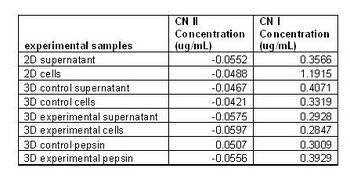 Our Collagen II samples showed no absorbance at 420 nm. Perhaps if these samples had been allowed to develop overnight some activity would have been observed. Since we did not obtain any Collagen II data from ELISA, we cannot make any comment on the ratio of Col II: Col I based on this assay.