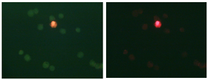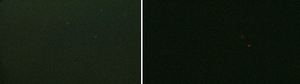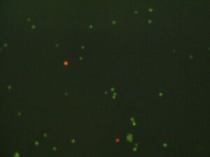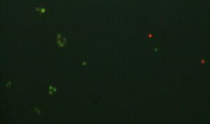 Caption for Agi's example pictures, 40X, used 1% alginatePurple Group. Left Figure: 10X FITC Filter, 2D Sample. Right Figure: 10X EthD-1 Filter, 3D Sample in 1% alginateRed Group. Left figure: 10X FITC filter, 3D with mechanical stress, 1% alginate. Right figure: 10X FITC Filter, 2D 1% alginateBlue Group. 10X FITC filter, 3D normal calcium concentration, 2% alginateBlue Group. 10X EthD-1 Filter, 3D normal calcium concentration, 2% alginateGreen Group. 10X FITC filter, 2D normal culture.Green Group. 10X FITC filter, 3D 2% Sigma brand low viscosity alginate culture. Pink Group. 10X FITC filter, control culture in 1% alginate. Pink Group. 10X FITC filter, weighted culture in 1% alginate. Weights were used to test response of chondrocyes to mechanical stress. Yellow Group. 2D sample 10X Yellow Group. 2D sample 40X Yellow Group. 3D sample 10X