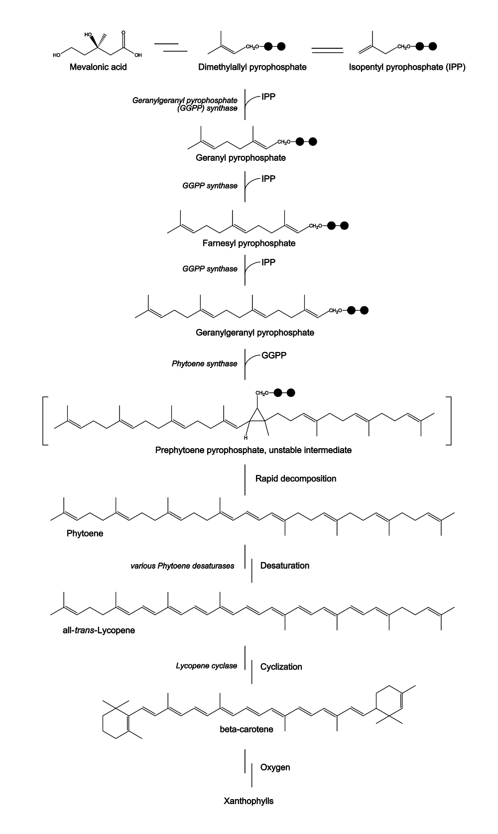- Yi Kou 08:43, 26 March 2012 (EDT):I find this needs a little bit more explanation. β-carotene is not missing the typical isoprenoid structure, I was wondering at the time of counting the right 8 isoprene units by counting the double bond (which is usually the method for terpenoid, as is often seen in the steroid synthesis, esp lanosterol). Actually, head to tail or head to head does not have relation to how many double bonds/typical isoprene there are in the structure. Head to tail can also result in right number, and also with release of the two PPis (esp. lanosterol or other steroids I remember). β-carotene has nine double bonds out of 8 isoprene building block because of an cyclopropane containing prephytoene intermediate formed during the synthesis (catalyzed by phytoene synthase using GGPP to make phytoene). Chemically, I think this kind of formation is not favored (though releasing high energy PPis), but may be under phytoene synthase, the cyclization is favored with delta G compensated biochemically or structurally (since head to tail connection easily result in future multi-ring structure).