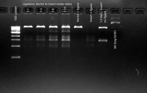 - Bjorn Hogberg 14:13, 7 May 2008 (EDT):Hi, I'm having some real difficulties with my ligations (and/or transformations). The goal is to insert a 1.4kB PCR amplified insert into a 7.2kB M13mp18 vector cut with BamHI and HindIII. The PCR product is also cut with BamHI and HindIII prior to purification and ligation. I have tried many different strategies including: gel purification of insert vs. PEG purification of insert, room temp ligation vs. 16°C and 4°C ligations, ligation overnight vs. just an hour, Antararctica Phosphatase treatment of vector vs. no treatment and a bunch of other stuff like varying ratios vector:insert. This gel is results from a 4°C overnight ligation (T4 DNA ligase from NEB) on Ant.Phosph. treated vector, I use 50ng of vector in a 20µl volume. It seems like the insert is ligating to itself a lot but never to the vector.