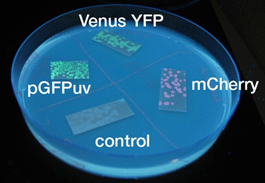 We selected GFP, Venus YFP, and mCherry. The latter two were chosen because Venus YFP matures quickly(1),and we can easibly recognize mCherry coloration(2).