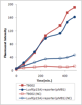 from (Ptet-LuxR-pLux-GFP-p15A) was greatly reduced (Fig. 2).