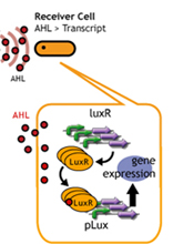 3. AHL produced by sender is diffused in the LB-agar plate and the receivers on the nitrocellulose filter synthesize GFP when they are stimulated by a certain amount of AHL.