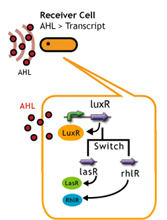 The AHL is produced by the AHL sender and stimulate the AHL receiver, triggering the GFP expression.