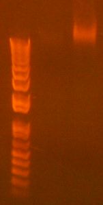 - Centrifuged the cells from the "ATC" and "No ATC" vials and ran the supernatant in a gel to look for genomic DNA. If self-lysis had occured, there would be more genomic DNA in the supernatant of the "ATC" vial. This was the case as shown below: