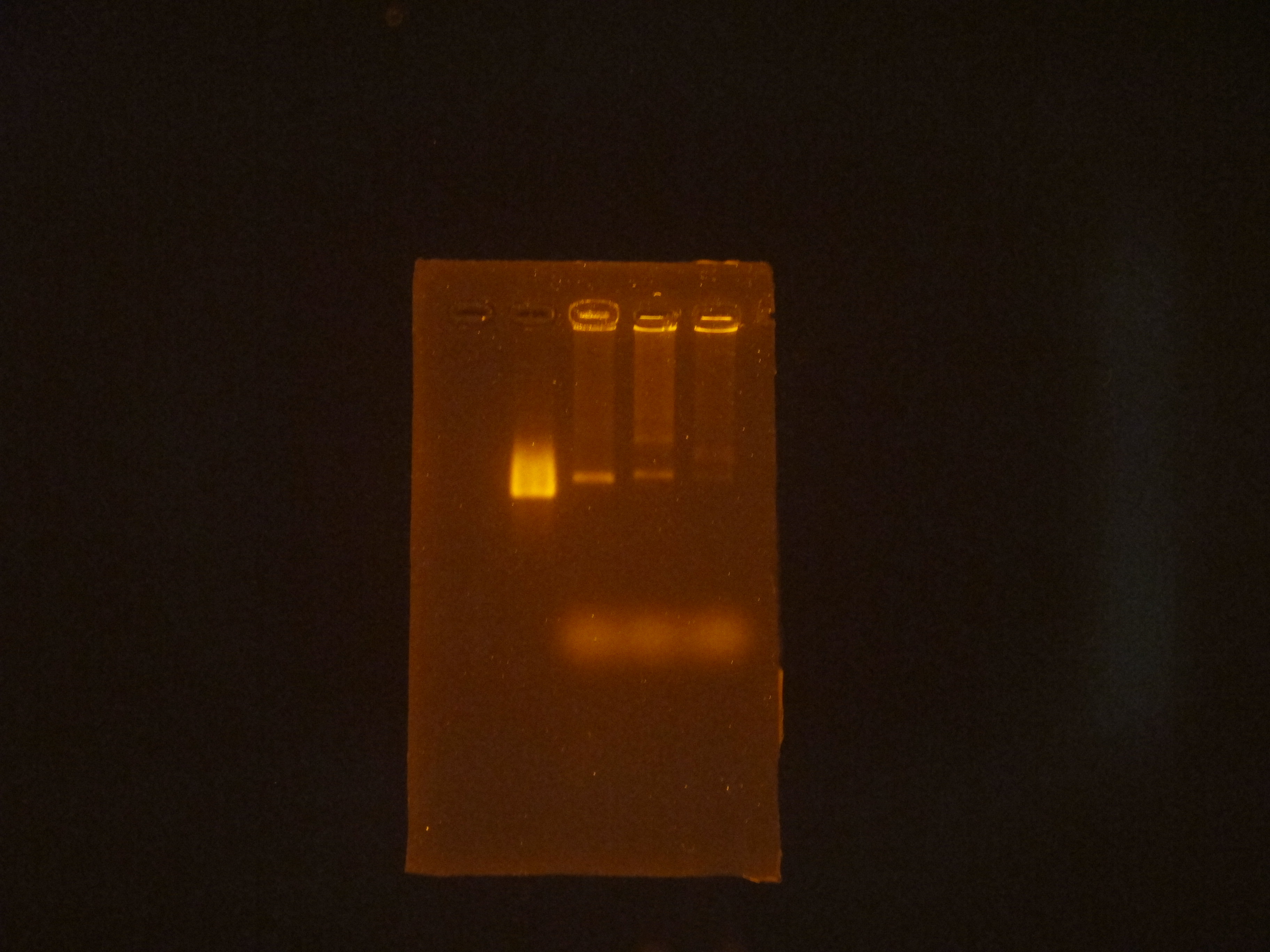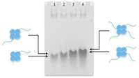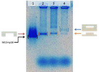 We confirmed that streptavidin can bind with biotin by electrophoresis (Fig. 8). Lane 1 is the ratio of Streptavidin to biotinylated DNA equals the ratio of 1 to 1, Lane 2 is the ratio of 1 to 2, Lane 3 is the ratio of 1 to 3, Lane 4 is the ratio of 1 to 4. The higher the ratio of biotinylated DNA, the lower electrophoretic mobility the band became. This shows that streptavidin combines with biotinylated DNA regularly.