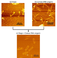 It was confirmed that Stage and Convex DNA origami were constructed. Next, we tried to combine them. The result is shown in Fig. 5 (c) and confirmed that Stage was combined with Convex DNA origami which width was observed ~17 nm. At first time, the yield was ~20% and a reason of the low yield is that the mixture was only incubated at room temperature without slowly annealing. After this, Stage + Convex DNA origami was constructed with slowly annealing from 40℃ to room temperature and the yield rose up to ~60%.