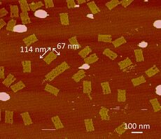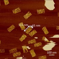 First, We constructed shrunk DNA origami and the result is shown in Fig. 12 (a). As you can see, shrunk DNA origami was successfully constructed. Most Origamis are shrunk by 9 nm as compared to original DNA origami (Fig. 12 (b)) by blunt-end π–π stacking interactions within a molecule.