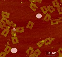 Third, we prepared DNA origami having a capability of shape selective capturing “Bear Trap”. We shown Fig.15 to the result of AFM observation. This result suggest that the architecture was formed Origami with the square hole in the center by π- π stacking interaction. We prepared plus shaped DNA origami for allow it to Bear Trap. The result showed string of plus shaped Origami. The next time, We mixed Bear Trap with plus shaped DNA origami. Against the odds, plus shaped DNA origami was not captured Bear Trap. Because we thought that Bear Trap's π- π stacking interaction is too strong.