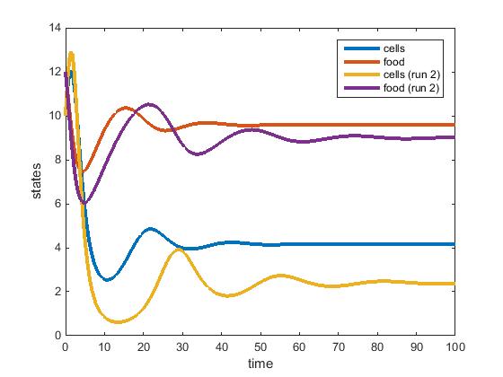 Figure 4 (above) shows the plot of time versus state for the chemostat model without being altered and the chemostat with the dilution adjusted. In this plot, run 2 signifies the run where the dilution (q) was reduced from 0.15 to 0.075.