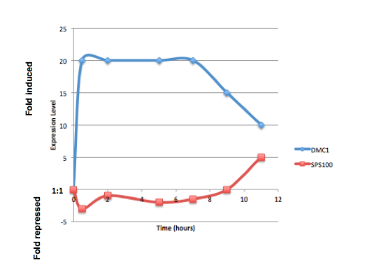 - Most spots would be yellow at the first time point, because there is an overlap between the green (fold induced) and red (fold repressed), which appear yellow. The biological reason that most spots appeared yellow is because there are an equal number of genes being induced and repressed.