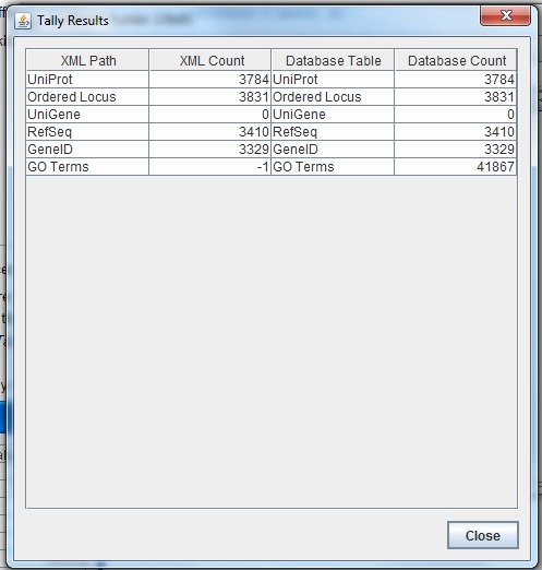 Run the TallyEngine in GenMAPP Builder and record the number of records for UniProt and GO in the XML data and in the PostgreSQL databases (or you can upload and link to a screenshot of the results).