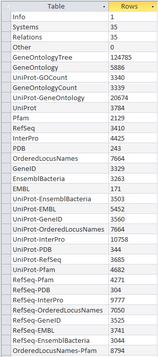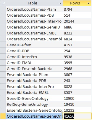 - Open the UniProt, RefSeq, and OrderedLocusNames tables. Scroll down through the table. Do all of the IDs look like they take the correct form for that type of ID?
