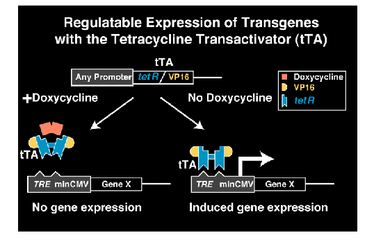 In the tTA system, gene expression is driven by a minimal promoter fused downstream of seven operator sequences (TRE) of the E. colitet operon (fig. 1) (1-2). Since the TRE promoter is bacterially derived, it is inactive in mammalian cells, unless the tTA protein is expressed in the same cell. The tTA system has been used successfully in cultured cells and in transgenic mice to drive expression of reporter and oncogenic genes(3-5). By using the tTA system, several groups have reported target gene induction of 500- to 1,000,000-fold in transgenic mice (3-5). In the tTAsystem, tissue specificity is generated by varying the promoter driving tTA gene transcription (fig. 1). Temporal control over transgene expression is generated by the presence or absence of tetracycline. Thus, by usingthe tTA system, gene expression can be studied in specific mouse tissues in adult mice or during specific developmental stages.