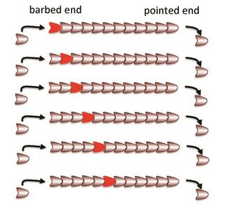 Three phases of actin polymerization have been identified: lag period, elongation phase and equilibrium phase [11]. Actin polymerization begins with a collection of actin monomers (G-actin) called a “nucleus.” The polymerization process begins with stabilization of the nucleus by “nucleation,” before the elongation of the polymer. The addition of monomers yields a growth rate of about 1 micrometer/second [11]. In polymerization, monomers are being added to both the sharp and barbed end but addition is primarily favored on the barbed (positive) end and disassociation is primarily found at the pointed (negative) end. After the elongation, the filament reaches equilibrium with monomer concentration. This concentration of monomer, critical concentration, determines if addition to or dissociation of the filament will occur. The addition and disassociation of actin from subsequent ends of the polymer yields a phenomenon called treadmilling [11]. Treadmilling can be seen when a monomer is added to the barbed (positive) end and ultimately moves down the polymer until it eventually disassociates at the pointed (negative) end (Figure 3). This polarity of the polymer is what drives forward motion of the cell. The role of actin binding proteins on polymerization also has a significant impact on how quickly a cell is able to move. As previously mentioned, polymerization requires nucleation, which needs nucleators. A common nucleator is, actin related protein complex 2/3 (ARP2/3) [11]. This actin binding protein can also bind to existing filaments and cause branching of the actin filament at each of its binding sites [4]. Each branch consists of a Y-shape at a 70 degree angle from the original filament (Figure 4)[11]. By branching the actin, a second barbed end is formed and therefore the polymerization rate may be doubled provided there is enough G-actin available. Cofilin is another actin binding protein which produces a similar effect by splitting the polymer in half, thus producing a second barbed end and increasing the polymerization rate [4]. For a closer look at actin polymerization and the effects of binding proteins Arp2/3 and Cofilin, an Actin Polymerization video from the Mechanobiology Institute at the National University of Singapore can be viewed. Actin polymerization can also be affected by capping proteins that bind either to the barbed or pointed end. An example of a capping protein is CapZ, which binds to the barbed end and prevents polymerization [11]. This in turns shortens the polymer because disassociation is occurring on the pointed end.
