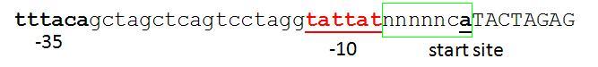 - Reshma 11:12, 21 August 2006 (EDT): I agree that we should have a default standard for the promoter-RBS junction. But in looking at the sequence logo for E. coli promoters, I think the typical nucleotides for the -1 and +1 positions are CA. In the absence of any strong reason to go with another scheme, why not go with E. coli promoter consensus? So perhaps something like ...