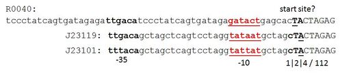 This basically follows from Chris & Reshma's discussion below. The only addition is that the standard requires a defined spacing between the -10 box and the CAT sequence. The A in the CAT sequence should be the transcription start site. The reasonable spacing along with the use of CAT (which is the 'consensus' -1,+1,+2 sequence - see table) should hopefully lead to predictable transcription start at the 'A'. Unfortunately the current Berkeley promoter library / R0040 don't conform to this standard. I suspect their transcriptional start is at the first A in the BB junction, but it's hard to know because the sequence isn't obviously optimal for a transcription start though it's not bad (see fig).
