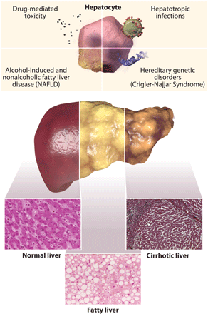 This category largely makes up liver-based metabolic disorders coming from defects in enzymes and transport proteins. Some examples include, Crigler-Najjar syndrome, phenylketonuria, and oxalosis [1]. This category is marked uniquely by the lack of tissue scarring architecture and is the most likely to show successes in cell (hepatocyte) transfer therapies.