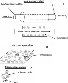 Intravascular implants are perfusion chambers that are directly connected to the vascular system, where blood flows through hollow fibers. These implants allow for adjustable mass-transfer rates but risk damaging blood vessels during implementation. Macroencapsules contain a large mass of islet cells within a diffusion chamber, and are extravascular. They are implanted in the peritoneal cavity and subcutaneously, and are easily implanted and retrieved, but are limited in oxygen diffusion and nutrient transport. Microencapsulation is the spherical encapsulation of single islets, or small groups of islets. Methods of constructing the microcapsules include emulsion, photopolymerization, micro-machined nanoporous microsystems, and electrified coaxial liquid jets. These microcapsules allow for increased oxygen diffusion and nutrient transport, but are difficult to remove if necessary [15].