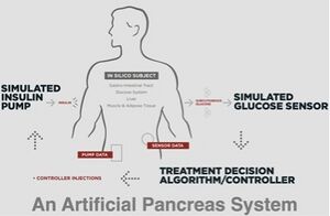The fully automated, closed-loop artificial pancreas system is a feedback-controlled device with an algorithm that automatically adjusts the rate of insulin delivery by an insulin pump, based on real-time continuous glucose monitoring [25]. The utilization of an implanted artificial pancreas has been shown to decrease the error in inaccurate blood glucose measurement and would work throughout the night to reduce nocturnal hypoglycemia. The MD-Logic is a wireless, fully automated, closed-loop artificial pancreas system that uses algorithms and has a personalized alert system, to ensure safety. The algorithms for alerts integrate data derived from past glucose levels, insulin delivery, and models of insulin pharmacodynamics. Models created using software such as MATLAB and MathWorks monitor current glucose readings to ensure that the artificial pancreas system is working properly and the patient is safe [19]. The Diabetes Wireless Artificial Pancreas Consortium was established to test the MD-Logic system, and overnight youth camps were created to monitor the system in an out-of-the-hospital setting. The study was conducted on 56 type 1 diabetes patients from the ages of 10 to 18. The conclusions of the study demonstrated that on nights when the artificial pancreas was used, as compared to nights when the sensor-augmented insulin pump was used, there were significant decreases in the number of episodes in which the glucose level reached below normal. There were no significant between-treatment differences in the median overnight glucose levels than there were with the senor-augmented pump. There were significant improvements in the many measures of glycemic control and glucose variability with the artificial pancreas, and total overnight insulin doses were significantly higher during nights when the artificial pancreas was used in place of the sensor-augmented pump. Over time, glucose levels remained significantly more stable with the artificial pancreas, and there were fewer false hypoglycemia alarms. Patients experienced adverse effects when using both systems, but fewer of these effects were experienced nocturnally with the use of the artificial pancreas [19]. Regardless of the promising results from this overnight camp study, much more research is necessary before artificial pancreases can be implanted in the body [19].
