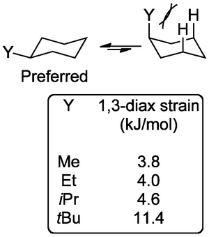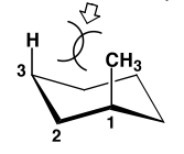 When the methyl is axial, there is a new steric strain, called a 1,3-diaxial clash, costing (in this case) 3.8 kJ mol-1.