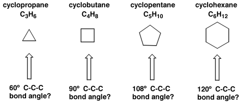 sp3 carbon likes to bond with angles of about 109°. If we look at cycloalkanes (they way we draw them on paper), we see that there is a problem - the structures must be strained.