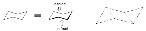 This may seem like an art class, but it's very important to be able to draw groups attached to cyclohexane. The first thing to get right is the ring itself. Let's start with the chair conformation, below. Now if we want to draw cyclohexane from the top, we just draw a regular hexagon, but if we want to indicate its real 3D shape, we draw it from the side: