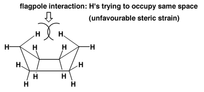 While cyclohexane's chair conformation has two different kinds of hydrogen atom environments, the boat conformation has four. The clash shown below helps explain why the boat conformation is less thermodynamically favoured.
