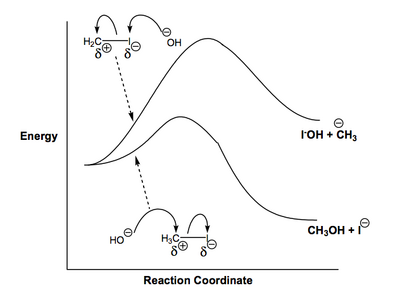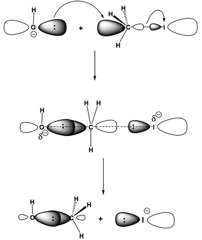 We all remember the SN2 reaction, where bond formation and breaking occurs in a single rate-limiting step. The HOMO in the examples below is the lone pair in an sp orbital on the hydroxide O, while the LUMO is the σ* orbital of the C-I bond.
