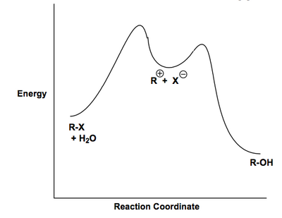 The energy profile for this reaction includes an intermediate - i.e. a local energy minimum referring to a theoretically isolable species. The intermediate is the carbocation