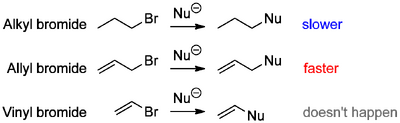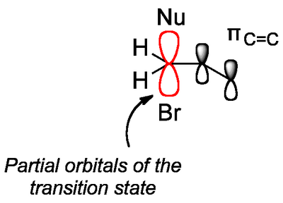 We're not meant to be talking about this, but the reason the substitution is faster at an allylic position is interesting. The effect is quite dramatic - allylic substitution is typically 100 x faster than substitution on an alkyl ("aliphatic") chain. The fact that the reaction is faster implies that the transition state is being stabilised by the adjacent π bond of the double bond. The transition state of an SN2 reaction has two partial bonds - one from the incoming nucleophile and one from the leaving group. These two partial bonds "derived from mixing a filled and a vacant orbital can be regarded as having to some extent the character of both. This means that stabilising delocalisation should be available from both electron donor and vacant orbitals" as Tony Kirby puts it very eloquently in Stereoelectronic Effects (section 5.3).