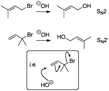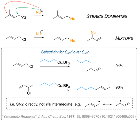 In general, where there is a choice of reaction site, an incoming nucleophile will be guided by sterics - i.e. in the case of prenyl chloride, below, the direct SN2 reaction will be favoured over the SN2' reaction because the former site is a lot less crowded than the latter. If things are not quite so clear cut (second example in the figure) then you should start to see mixtures of products. Is there a way to override this natural (steric-based) tendency? There are reagents you can use that will tend to favour the SN2' mechanism. These tend to be based on copper organometallic species (generally used for conjugate addition - here's a very nice explainer from a student at Harvard). Things like Gilman Reagents have been used, but below is an example of something called a Yamamoto Reagent (here's the paper) that displays a very strong preference for the SN2' mechanism - you might turn your mind to thinking of a reason why it's so good at doing this. Notice that the two reactions shown strongly suggest that the SN2' operates, and that there is no stepwise reaction via some radical or cationic intermediate, since then you would get mixtures of products, presumably.