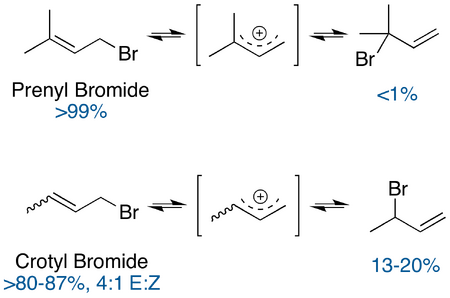 Notice in all these examples we're using allyl chlorides. Things are a little different for allyl bromides in the sense that bromide is a much better leaving group than choride, meaning that allyl bromide isomers are often found to be in dynamic equilibria under laboratory conditions. For prenyl bromide (below) the position of equilibrium very much favours the primary isomer (more substituted double bond) but for crotyl bromide things are a little more even, and there's a significant amount of the minor isomer present. The major is present as a mixture of the two double bond isomers. We need to be aware of such equlibria when predicting how such compounds will react! (Important Note: the numbers here are taken from Clayden, Greeves and Warren. I'm still searching for a good source for the numbers in the peer-reviewed literature, if anyone has any suggestions?)