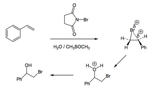 This reaction involves the addition of bromine to a double bond, as before, to generate an intermediate bromonium ion. However, when water is present, it is able to act as a nucleophile and open the bromonium ion ring to give a product with a bromine on one carbon of what was the double bond, and an OH group on the other carbon - a bromohydrin. Most often the reagents employed will be Br2 and H2O, but sometimes N-bromosuccinimide (pictured below) is used, since this is a convenient reagent that is easier to handle than bromine itself, but essentially generates Br2 in the reaction mixture (formally it maintains a low concentration of Br2 in solution via a surprisingly complex radical-based reaction mechanism).