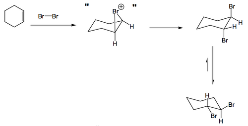 We covered this a little in the last lecture, but to be specific, when bromine adds to cyclohexenes, we obtain trans-diaxial products for the same reason as we observed such things in epoxide openings. Obviously the initial addition of bromine happens to one face or the other (to give the intermediate bromonium ion) but this is opened by the bromide ion to give the final trans product.