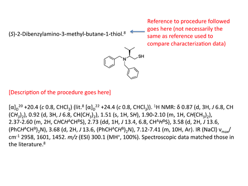 Examples of experimental procedures The way you write up a synthetic procedure should look a little like the lab book page above, but there are a few differences. The best way to see how to do it is to look at some recent theses, but here are some examples to give you an idea. Spot the difference! Sample procedure which contains errors: 5.2.2 Selective mono-BOC protection of 1R,2R-diaminocyclohexane (16)14 Conc HCl (36%, 0.78 mL, 9.07 mmol) was added to MeOH (100 mL) at 0 °C, the mixture was stirred for 15 min and slowly added to a solution of 1R,2R-diaminocyclohexane (1.035g, 9.07 mmol) in MeOH (100 mL) at 0 °C. After the addition is complete, the mixture was allowed to warm to rt. Stirring was continued for 15 min at rt before adding water (30 mL). The resultant solution was stirred for another 30 min at rt followed by (Boc)2O (2.38 g, 10.88 mmol) in MeOH (25 mL) The reaction mixture was stirred for 1 h, concentrated in vacuo to remove MeOH. Un reacted diamine was removed by partitioning with diethyl ether (100 mL×3). The aqueous layer was treated with 2N NaOH until it became pH 10. The liberated free amine was extracted in to DCM (50 mL×4) and combine extracts were washed with brine (100 mL) dried over Mg2SO4 and solvents were removed in vacuo to obtain t-butyl ((1R,2R)-2-amino cyclohexyl)carbamate as a white sticky solid (1.6 g, 82%). The same procedure after Mat has hacked at it: tert-Butyl ((1R,2R)-2-aminocyclohexyl)carbamate (16)14 Conc. HCl (36%, 0.78 mL, 9.1 mmol) was added to MeOH (100 mL) at 0 °C. The mixture was stirred for 15 min and slowly added to a solution of (1R,2R)-diaminocyclohexane (6, 1.04 g, 9.07 mmol) in MeOH (100 mL) at 0 °C. The mixture was allowed to warm to rt. Stirring was continued for 15 min at rt before the addition of water (30 mL). The resultant solution was stirred for another 30 min at rt. (Boc)2O (2.38 g, 10.9 mmol) in MeOH (25 mL) was added. The reaction mixture was stirred for 1 h and concentrated under reduced pressure to remove MeOH. The solution was washed with diethyl ether (3 × 100 mL) to remove unreacted diamine. The aqueous layer was taken to pH 10 by the addition of 2 N NaOH and extracted with DCM (4 × 50 mL). The combined extracts were washed with brine (100 mL), dried over Mg2SO4 and concentrated in vacuo to give the protected amine as a white sticky solid (1.60 g, 82%). Examples of experimental data Novel compound: