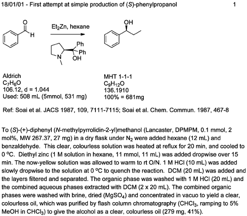 Note - all this stuff is old and is being moved to https://todd-lers.github.io/about/internal.html Lab Book Write-upDO NOT WRITE NOTES ABOUT WHAT YOU HAVE DONE ON LITTLE BITS OF PAPER When writing your lab book, you should include all details, but in a concise manner. The reason for keeping a lab book is so that the people who come after you can understand and replicate what you have done. You are writing it for them, not for me. Your lab book must be written in pen, not pencil. You must never remove or add pages. Mistakes must be crossed out lightly, so that they may still be read. Do not use white-out/Tippex. All lab book pages must be dated somewhere, and when complete, should be signed. Ideally periodically you should get another member of the group to sign and date your lab book pages. Each new experiment must be assessed for safety. Instructions on how to do this are given in the School's safety handbook here where you can also download templates for doing risk assessments. All relevant TLC’s must also be drawn in pen, and RF values given to two decimal places, as well as the solvent system used for each. (Drawing TLC’s allows you to throw away your TLC plates) The write up should look something like this: