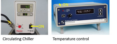 - Encienda el control de temepratura desde el switch que se encuentra en la parte de atrás a la izquierda. Luego, oprima el botón run/stop. . Si la temperatura no cambia cuando está manipulando el software Vinci, presione el botón run/stop nuevamente.