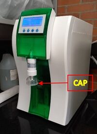 - Presiones “DISP” (RO, destilada) o “FLUSH” (UP, desionizada) para seleccionar la calidad del agua. Asegúrese que el volumen del agua en el tanque es al menos del 20%.