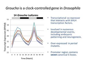 Circadian clocks exist in many organisms and are rhythmically regulating expression of genes responsible for a variety of cellular processes. The Groucho gene is very important in the early stages of development in fruit flies and it is known to be rhythmically expressed in the fly brain. How Groucho is regulating circadian genes is less clear.