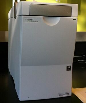 The Agilent Bioanalyzer measures DNA, RNA, proteins and cells in a single platform, two-assay system using electrophoresis and flow cytometry.  The digital output is easy to interpret and gives sizing, quantitation and quality control results with as little as one microliter of sample.  While user-friendly, the Bioanalyzer is an extremely sensitive instrument.  New users are encouraged to familiarize themselves with the use and data interpretation methods.  Please see the User's Manual for more information:File:Agilent Manual.pdf.  To analyze data from a personal computer it may be necessary to download .Net 4.0 software. .Net 4.0