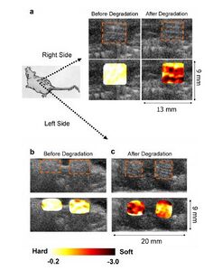 One example of such an application is the imaging of a tissue scaffold in vivo as it degrades. Studying the rate at which a scaffold degrades is an important issue for any regenerative study, as the degradation rate of the scaffold should be the same as the rate at which the new tissue grows. As engineered tissue scaffolds degrade, the stiffness of the scaffold also decreases, and the construct experiences a decrease in the elastic modulus. This would be a good way to quantify degradation, as the degradation rate could be measured by mechanical means, but it would involve the destruction of the scaffold, as well as excision from any in vivo system. Ultrasound imaging can bypass the excision of the scaffold, as well as continuously measure the degradation of the scaffold without having to destroy the structure. Experimentation has been done to relate both in vitro and in vivo strain maps of Poly(1,8-octanediol-co-citric acid) (POC) scaffolds to the contrast of ultrasound imaging, as shown in Figure 3 [2].