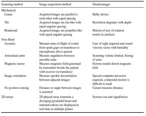 Three-dimensional methods of generating ultrasound images have also been explored to increase the usefulness of the image, as well as to increase the reproducibility of the image for following studies. Also, finding volume of tissue regions is easier and more accurate with a three-dimensional representation of the system, rather than by estimating the volume with some cross-sectional, two-dimensional images. Multiple scanning methods have been developed, each with some disadvantages. Most of the methods use the same transducers used for two-dimensional imaging, but incorporate some sort of positioning and orientation system that images an extra dimension. Four approaches that have been developed include mechanical scanners, free-hand scanners with position sensing, free-hand scanners with no position sensing, and two-dimensional arrays. The image acquisition method, as well as each method’s disadvantages, are outlined in Figure 2 [4].