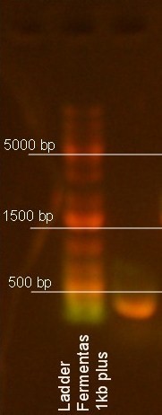 - 5ul sample + 1ul dye - ladder: 3-5ul - run at 100V for about 20 minutes - gel looked good