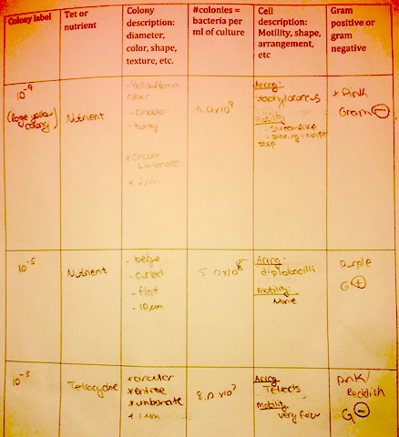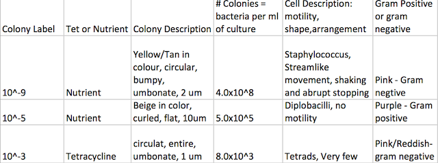 One week prior to this lab, plates a serial dilution of a sample from the hay infusion culture was prepared so that it could be observed. In lab today the various plates were observed in order to determine the characteristics of bacteria. The plates that contained an antibiotic (tetracycline) were also compared to plates that had no antibiotics in order to observe antibiotic resistance. A PCR preparation was also started in order to illustrate the significance of DNA sequencing in the identification of species.