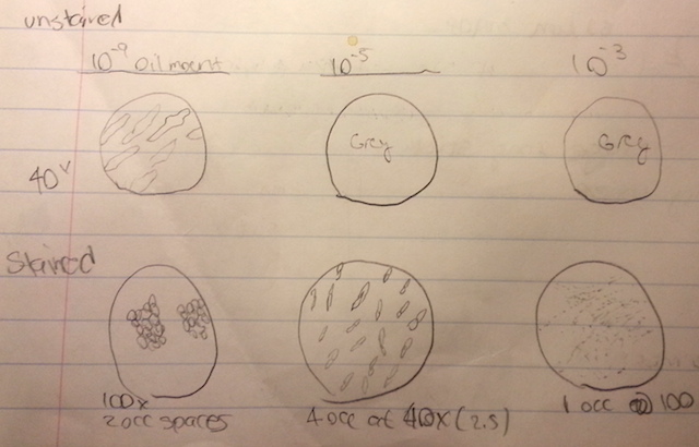 9. After the gram stain is done, focus in on the sample at a low magnification, then observe the slide under 40X and the oil objective. (coverslips are not used with gram stains).