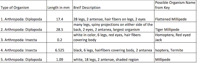 The organisms that were observed ranged from 28.5mm being the largest, to 0.2mm being the smallest. The Diplopoda Centipede seemed to be considerably larger than the Insecta that were observed. The organisms that reside in leaf litter are fairly diverse because the dead organic matter releases nutrients into the soil. It also keeps the soil moist and serves as protection for the individuals residing under it. Some organisms commonly found in this environment are worms, decomposers, snails, and spiders. Different types of fungi and bacteria will also be present as we discovered in lab 3. (Lin,2012)