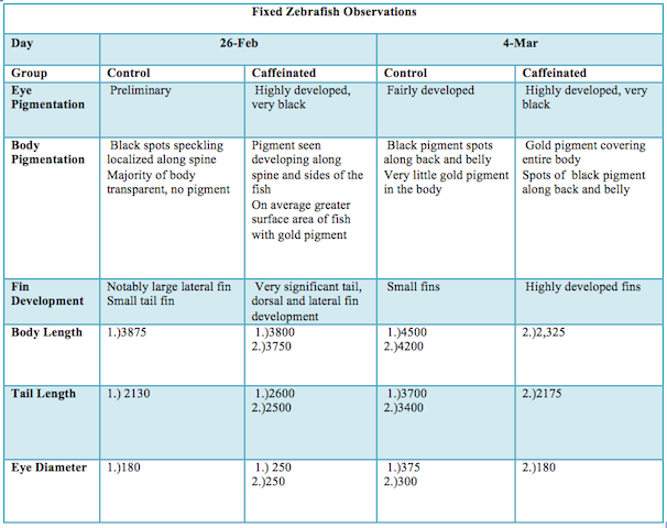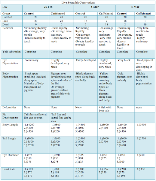 The caffeinated zebrafish showed a higher rate of developing deformities (bent tails, enlarged/undersized eyes), a decreased reactivity to touch, a lower heart rate, and a smaller body size in comparison to the control group. Approximately two weeks into the study there was also a massive die off of the caffeinated group.