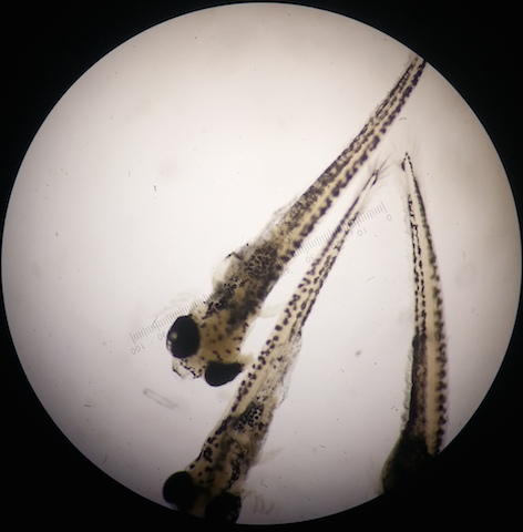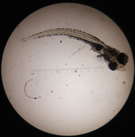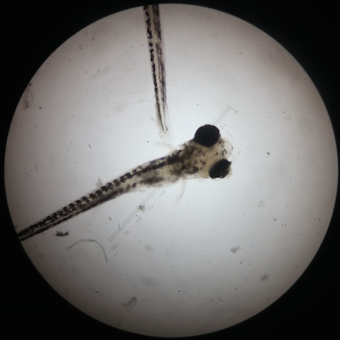 5. On day 7: Fix up to three larvae from the control and three from the test dish (number depends on the number surviving and consult with your TA). Use a dropper to get them into the tube. Add 1 drop of tricaine solution per ml of water. Your TA will add the paraformaldehyde and store the samples. You will do another fixation on day 14 and make measurements described in step #7.
